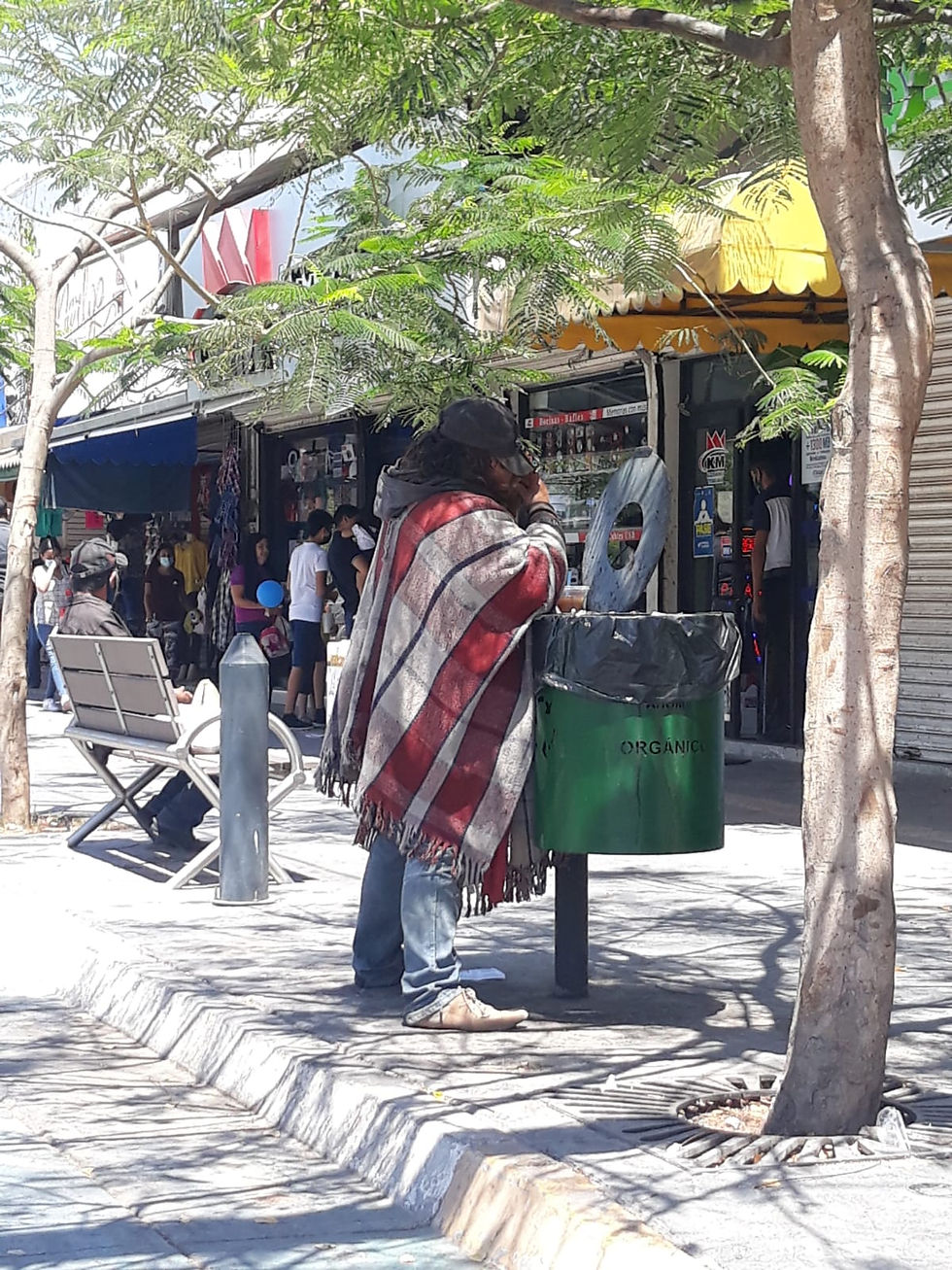 *¡La comida callejera más auténtica no solo está en una carreta de tacos o de hot dogs, sino con frecuencia en los botes de basura y eso lo sabe este goloso indigente quien en pleno domingo pudo engullirse cuanto tuvo en sus manos de frutas encontradas en los contenedores de Los Mochis. La vida de calle es muy dura!