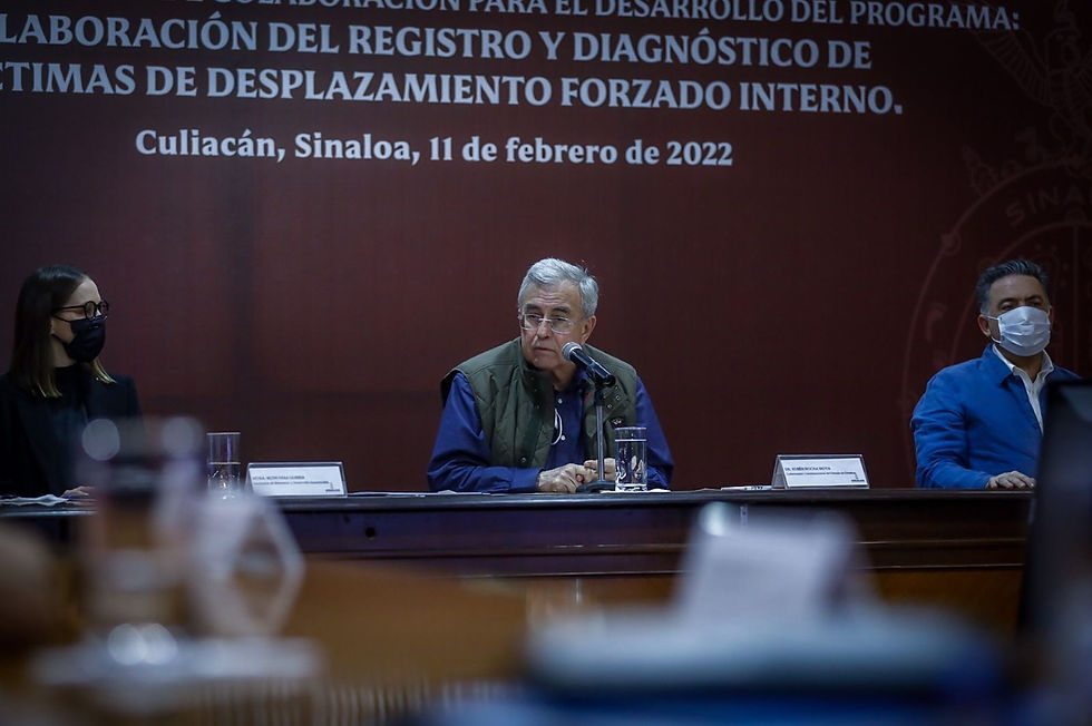 •El gobernador Rubén Rocha Moya signó con la rectora de la Universidad Autónoma de Occidente, Sylvia Paz Díaz Camacho, el convenio para la elaboración del Registro y Diagnóstico de Víctimas de Desplazamiento Forzado Interno, que fue atestiguado por el presidente de la Comisión Estatal de Derechos Humanos de Sinaloa, José Carlos Álvarez Ortega, y por el representante de la Oficina del Alto Comisionado de las Naciones Unidas para los Refugiados, Josep Herreros, este último a través de una video conferencia, al igual que los representantes de los diversos colectivos que existen en el estado.