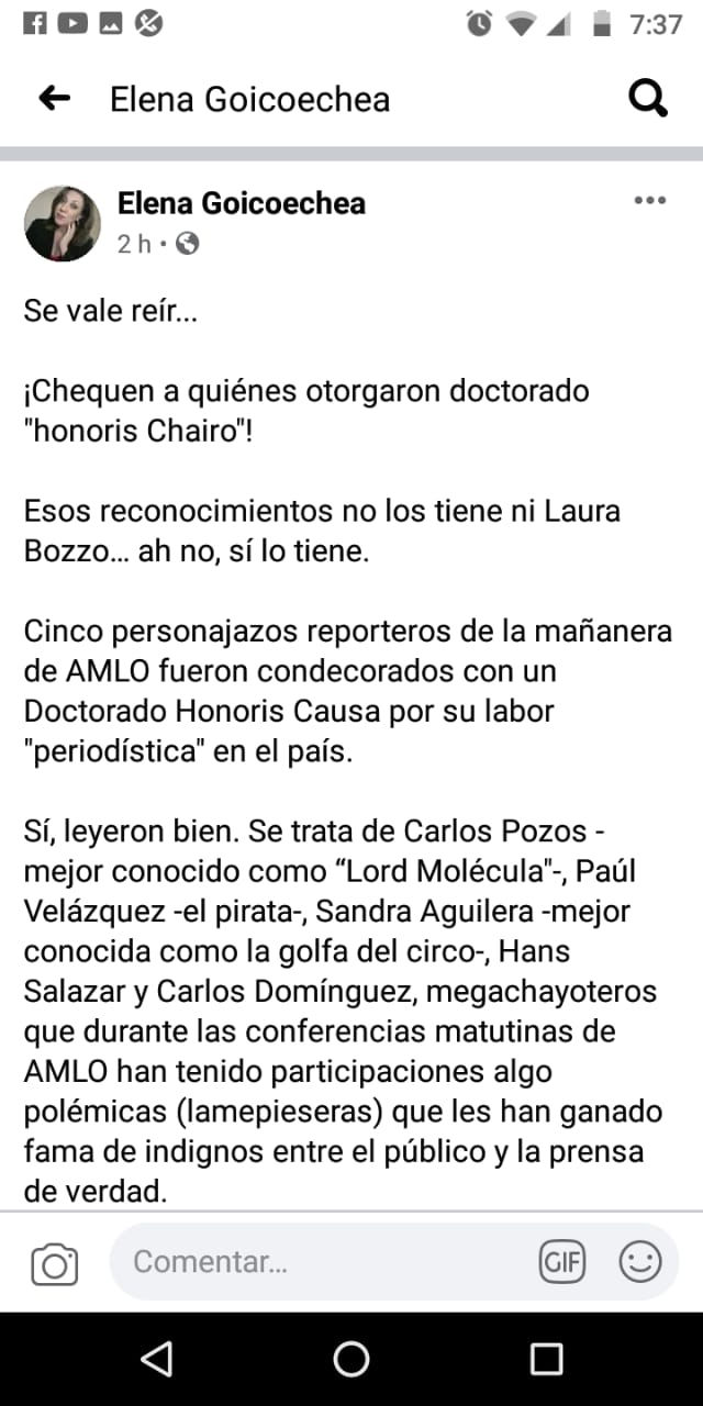 Sin embargo. Para el Consejo Doctoral Mexicano, este tipo de reconocimientos, como el doctorado otorgado a Laura Bozzo, no tienen validez.