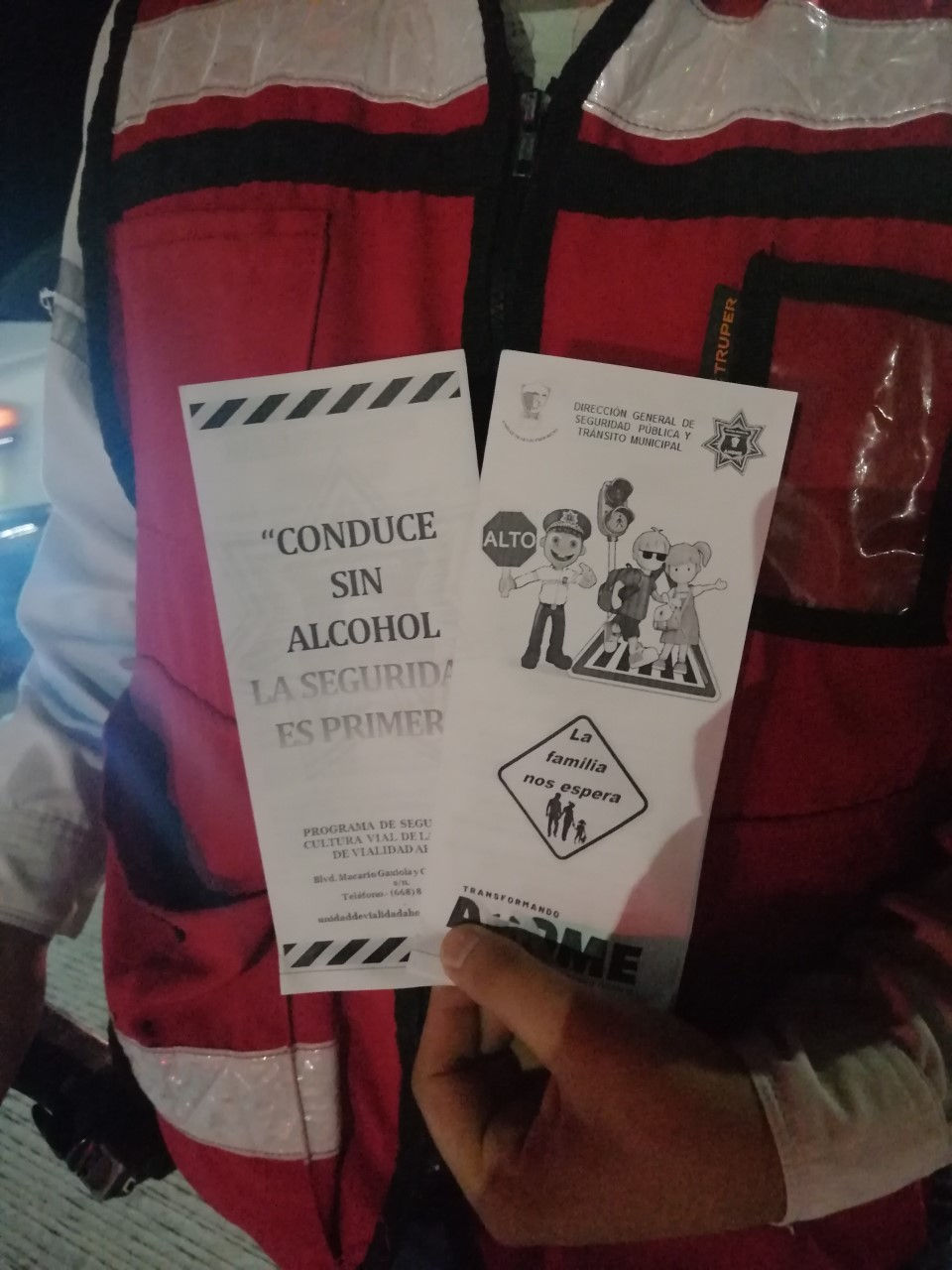 Por tal motivo, desde el mes de diciembre de 2019, en los puntos de control establecidos, los agentes de Tránsito de la Unidad de Vialidad de la DGSPYTM, orientan a conductores a través recomendaciones como “No conducir un vehículo automotor habiendo consumido alcohol o algún tipo de droga”, a la vez que entregan un tríptico en el que incluye sus obligaciones. Hasta el momento, los agentes han entregado tres mil documentos.
