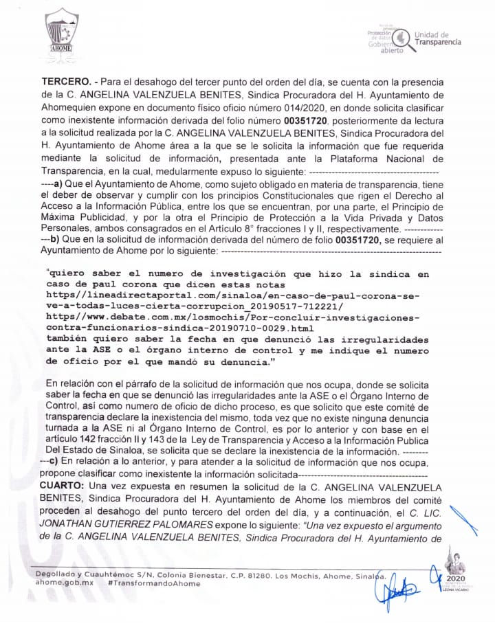 Es en el apartado de Actas y Resoluciones del Comité de Transparencia, del sitio web oficial del gobierno de Chapman en que se obtuvo el acta escaneada mediante la cual se informó a ciudadanos solicitantes, que la información solicitada ante la interrogante del número de investigaciones que hizo la síndica procuradora en el caso de Paul Corona citando notas periodísticas.