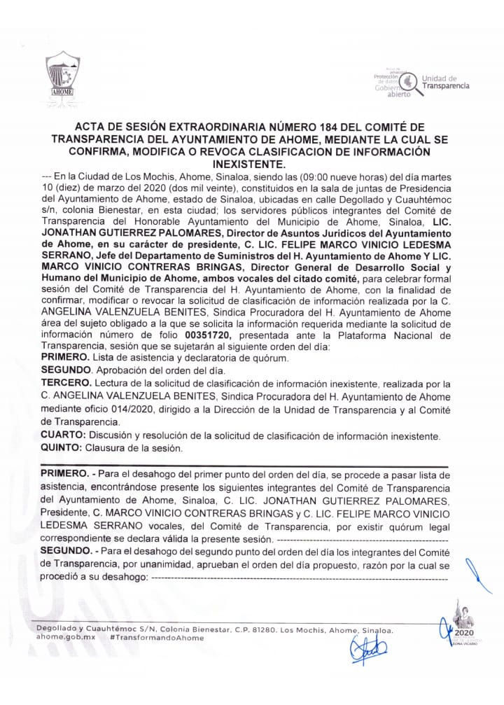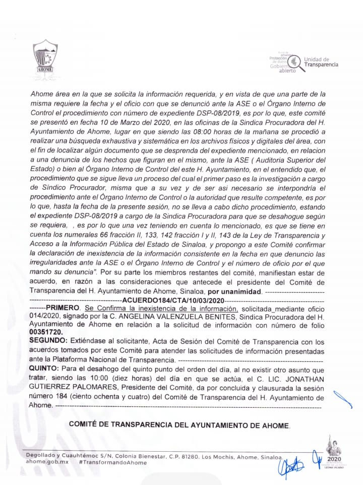 Fue la sindicatura de procuración quien respondió que la información solicitada era inexistente, ante el hecho de no tenerse turnada ninguna indagatoria contra el funcionario municipal, se alcanza a leer en el resolutivo primero del acuerdo de acta 184/CTA/10/03/2020.